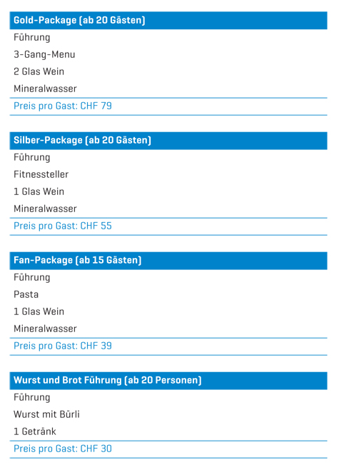 Erleben Sie mit Ihren Geschäftspartnern, Freunden oder auch Familienangehörigen aussergewöhnliche Momente in der swissporarena. Entdecken Sie die Geheimnisse des beeindruckenden Bijous und geniessen Sie bei feinen kulinarischen Köstlichkeiten die besondere Atmosphäre. Wir unterbreiten Ihnen folgende Angebote.